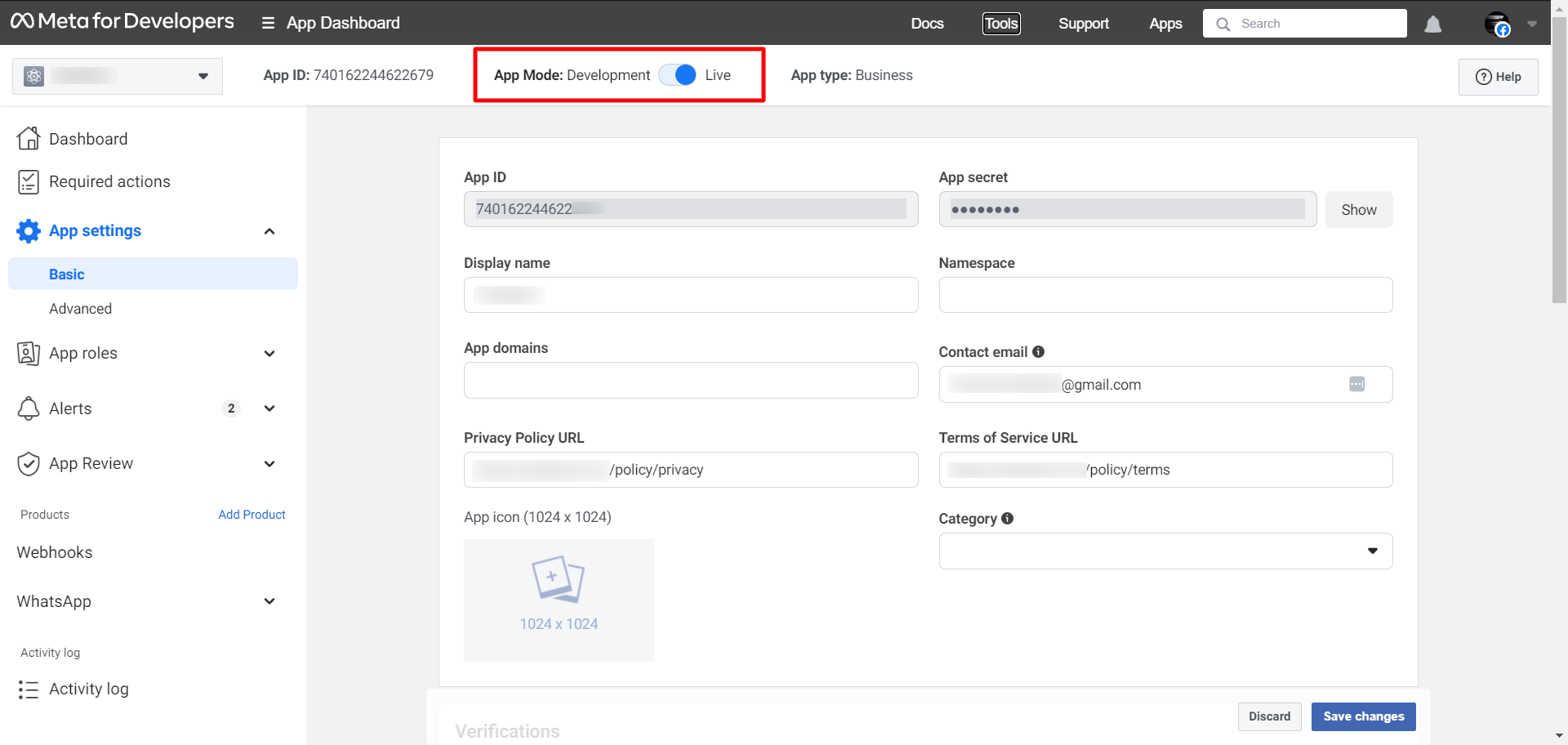 Then from the App settings, click on the Basic option and add the Privacy Policy URL and Terms of Service URL from the Aseptix. These URLs are available on the Connect bot page of Aseptix. After adding these URLs just click on the “Save changes” button.